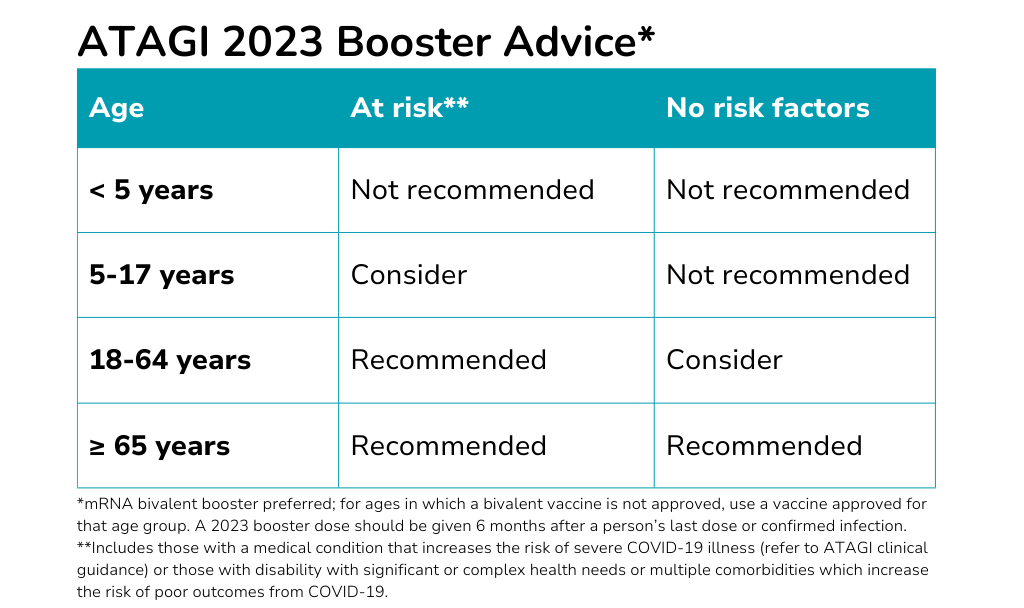 ATAGI recommends a 2023 COVID-19 vaccine booster dose for adults in the following groups, if their last COVID-19 vaccine dose or confirmed infection (whichever is the most recent) was 6 months ago or longer, and regardless of the number of prior doses received, based on an individual risk benefit assessment with their immunisation provider.